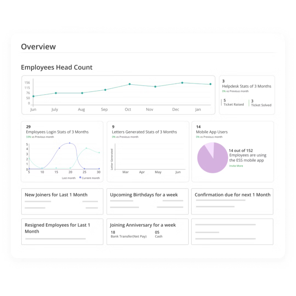 - Employee Lifecycle Management: Manage every stage from onboarding to exit, including letters, documents, background verification, ID proof, salary revisions, income tax, and more.